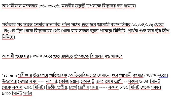 1st Term পরীক্ষার উত্তরপত্র অভিভাবক /অভিভাবিকাদের দেখানো হবে আগামী বুধবার (০৮/০৪/২৬)। উত্তরপত্র দেখার সময়---- নার্সারি, কেজি ওয়ান, কেজি টু এবং প্রথম শ্রেণী -- সকাল ৬:৪৫ মিনিট থেকে সকাল ৭:৪৫ মিনিট। দ্বিতীয়,তৃতীয়, চতুর্থ শ্রেণীর সময় ----- সকাল ৮:১৫ মিনিট থেকে সকাল ৯:৩০ মিনিট পর্যন্ত।